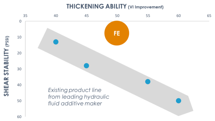 Fluid Efficiency recently invented a self-repairing additive that thickens extremely effectively, but also repairs itself when put into extreme shear conditions, much to the relief of engineers who have battled this trade-off for their entire careers. This product appears as the orange circle in the chart — way “off the line” of traditional technologies. It’s the Eiffel Tower of hydraulic fluid additives.
